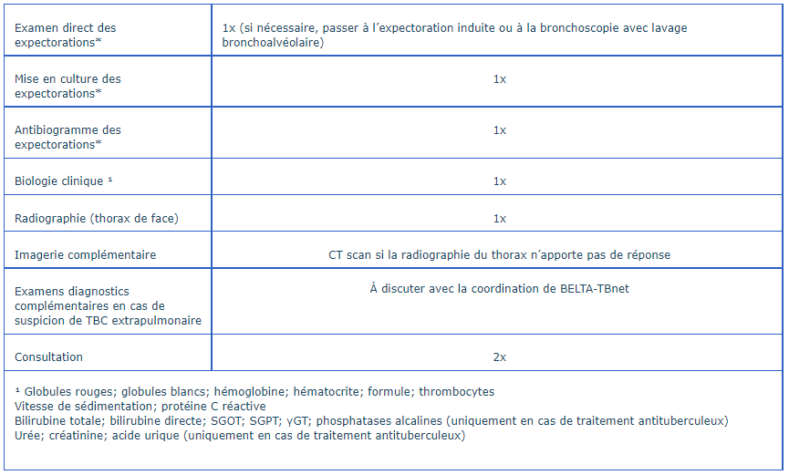 Examens et consultations remboursés par BELTA-TBnet pour les personnes présumées atteintes d’une tuberculose.