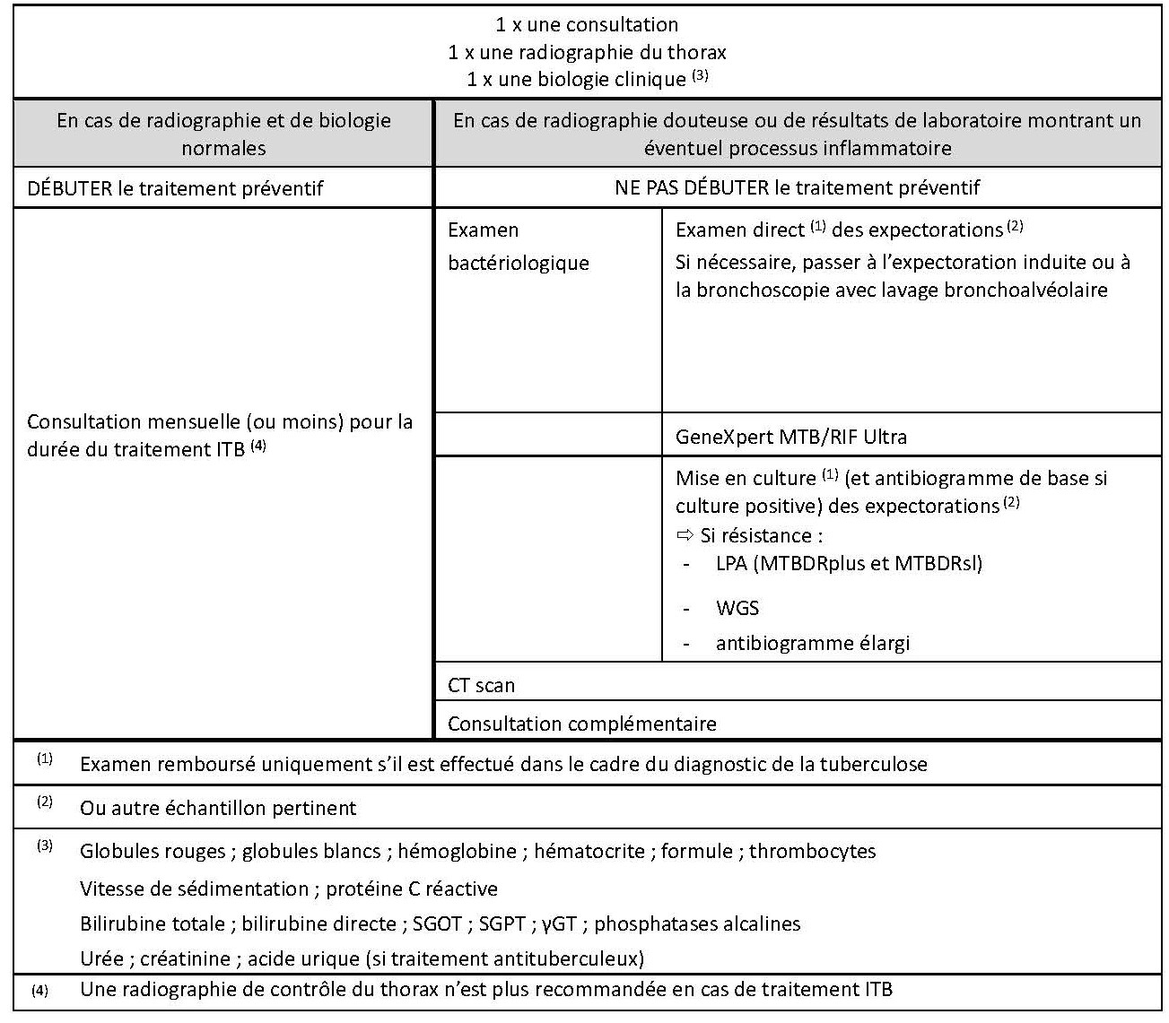 Examens et consultations remboursés par BELTA-TBnet afin d’exclure une tuberculose active avant un traitement préventif chez les personnes contact de patients tuberculeux contagieux.