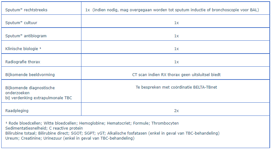 Onderzoeken en raadplegingen die door BELTA-TBnet ten laste kunnen genomen worden bij personen bij wie tuberculose vermoed wordt