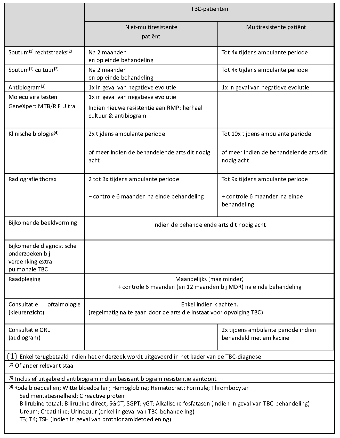 Onderzoeken en raadplegingen die door BELTA-TBnet ten laste kunnen genomen worden tijdens de opvolging van tuberculosepatiënten