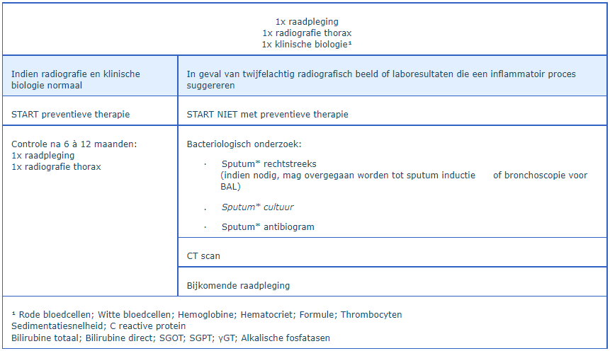 Onderzoeken en raadplegingen die door BELTA-TBnet ten laste kunnen genomen worden om TB uit te sluiten bij contacten van besmettelijke TB-patiënten die preventieve therapie moeten krijgen.